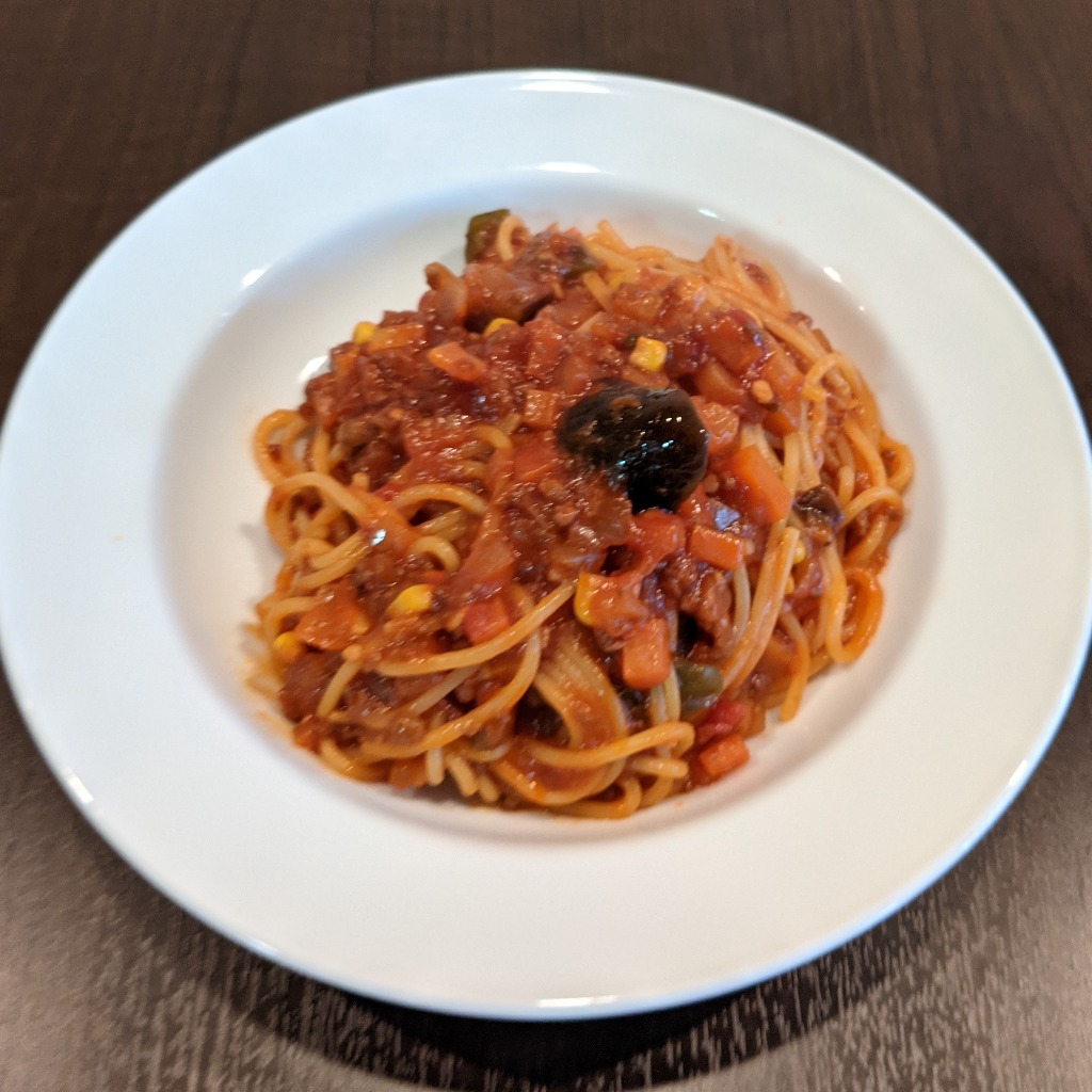 茄子とトマトのミートソースナポリタン(サラダ付き)